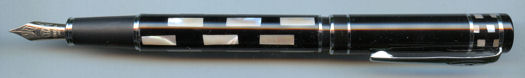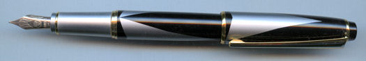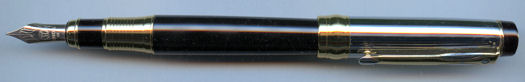 Black, acrylic barrel and chrome cap with an 8ct gold nib. |